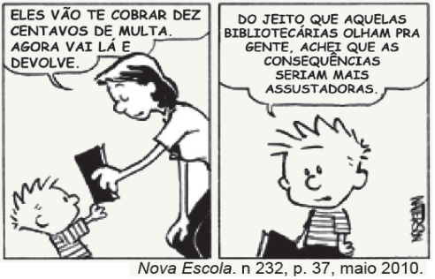 (A) apavorado, por imaginar castigos ruins por não ter devolvido o livro.