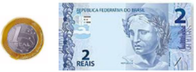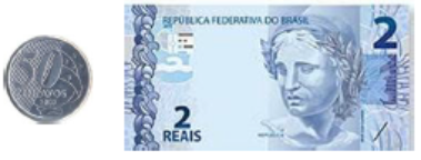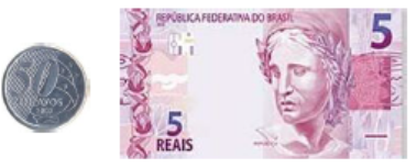 Lara trocou R$ 10,00 por 4 notas de mesmo valor e 4 moedas de mesmo valor. Quais notas e moedas Lara recebeu nessa troca?