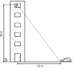 Um observador, da janela de um edifício, avista um carro parado a 12 metros de distância da entrada da portaria do seu prédio, conforme ilustrado no desenho abaixo.