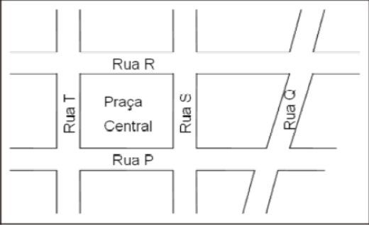 Se a praça central tem a forma de um retângulo, então a rua T é paralela à rua?
